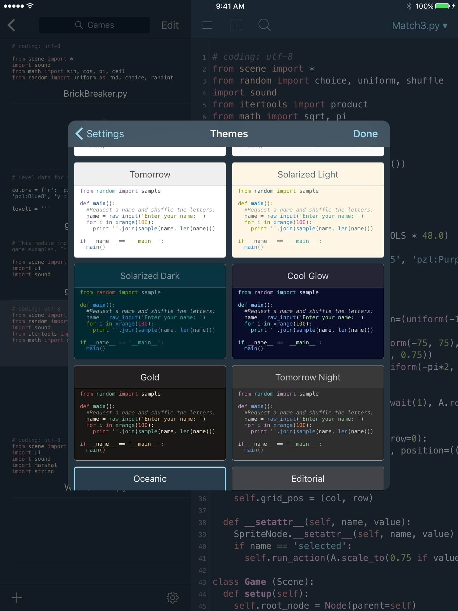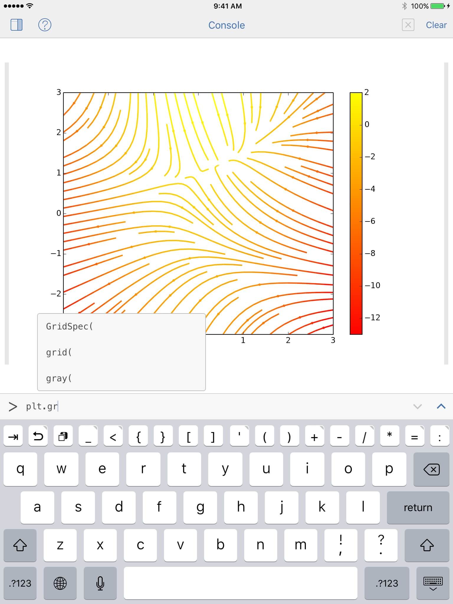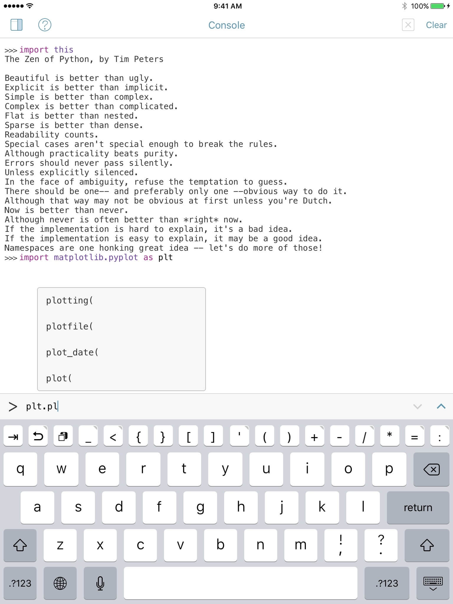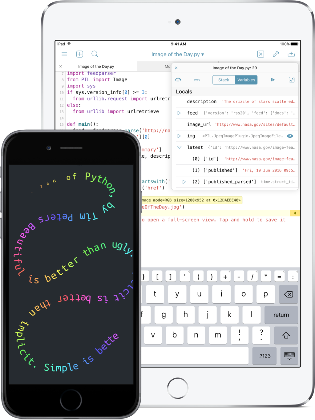 Pythonista is a complete development environment for writing Python™ scripts on your iPad or iPhone. Lots of examples are included — from games and animations to plotting, image manipulation, custom user interfaces, and automation scripts.